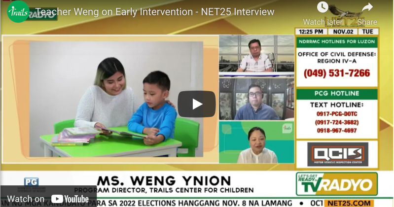 NET25 Interviewed Teacher Weng by Ern YnionFebruary 19, 2022February 19, 2022Leave a comment NET25 interviewed Trails Program Director Teacher Weng on the subject of Early Intervention last November 2, 2021. Watch the Interview Share this: Click to share on X (Opens in new window) X Click to share on Facebook (Opens in new window) Facebook Like Loading... Related